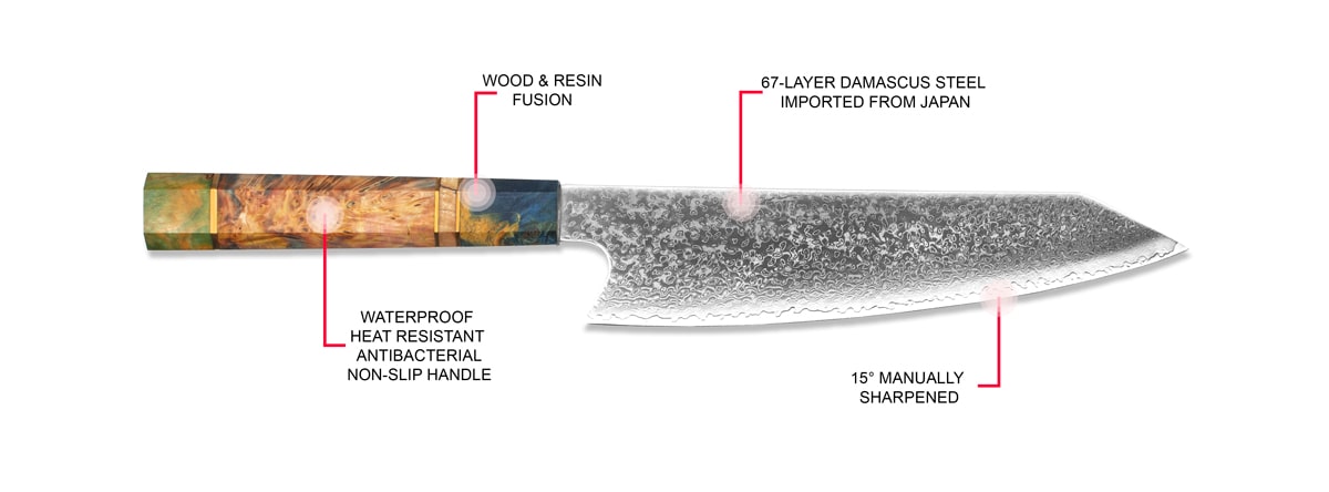- Präzisionsgeschmützte Klingen mit VG10 Japanischer Stahlkern für hervorragende Leistung und Haltbarkeit.