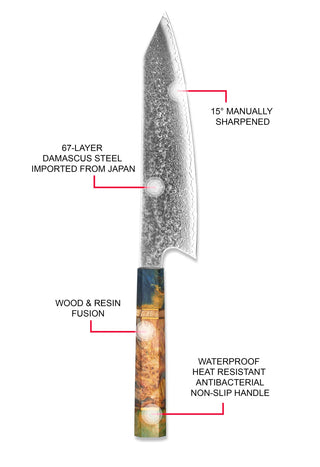 - 8,5-Zoll-Koch, 8-Zoll-Metzger, 8-Zoll-Kiritsuke, 7-Zoll-Santoku und 7-Zoll-Nakiri-Optionen.